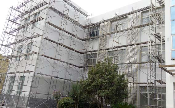 目前,辦公樓外墻裝修工作已經(jīng)過半,已完成的部分煥然一新,室內(nèi)裝修工作也在有條不紊地進行中。