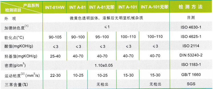 醛樹(shù)脂是一種無(wú)色或者微黃色的醛縮聚樹(shù)脂,不溶于水,能溶于絕大多數(shù)有機(jī)溶劑,與涂料/油墨配方中的原材料有良好的相容性,具有抗黃變性能。主要用作通用色漿的研磨樹(shù)脂及應(yīng)用于涂料/油墨配方中,具有良好的展色性,能夠有效提高涂料的附著力、硬度、光澤度、固體含量及涂膜的豐滿度。是一種多功能涂料/油墨助劑。根據(jù)其不同的性能和應(yīng)用范圍,醛樹(shù)脂有INT A-81、INT A-81無(wú)苯、INT A-101和INT A-101無(wú)苯系列產(chǎn)品。